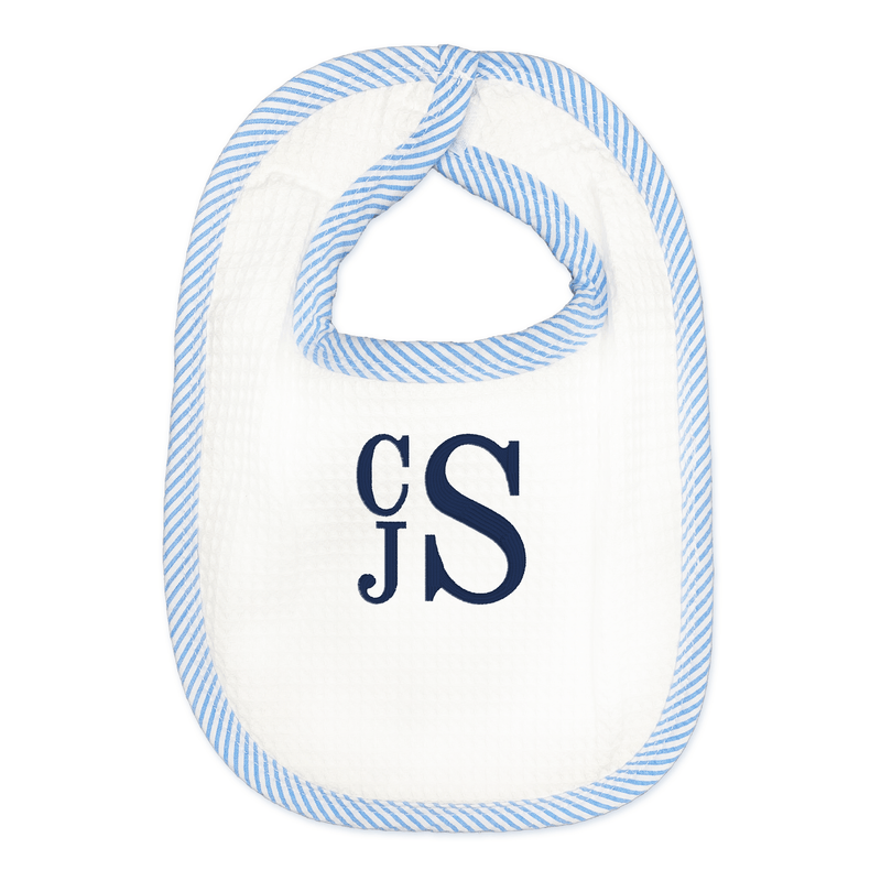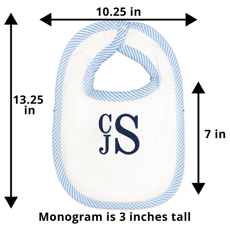 Elevate mealtime with our blue seersucker trim bib and burp cloth set. Crafted with a soft, luxurious terry cloth back and detailed waffle cone fabric front, each piece offers comfort and practicality. The bib, ideal for sizes 0-6 months, and burp cloth feature 100% stripe cotton seersucker trim for a touch of classic style.