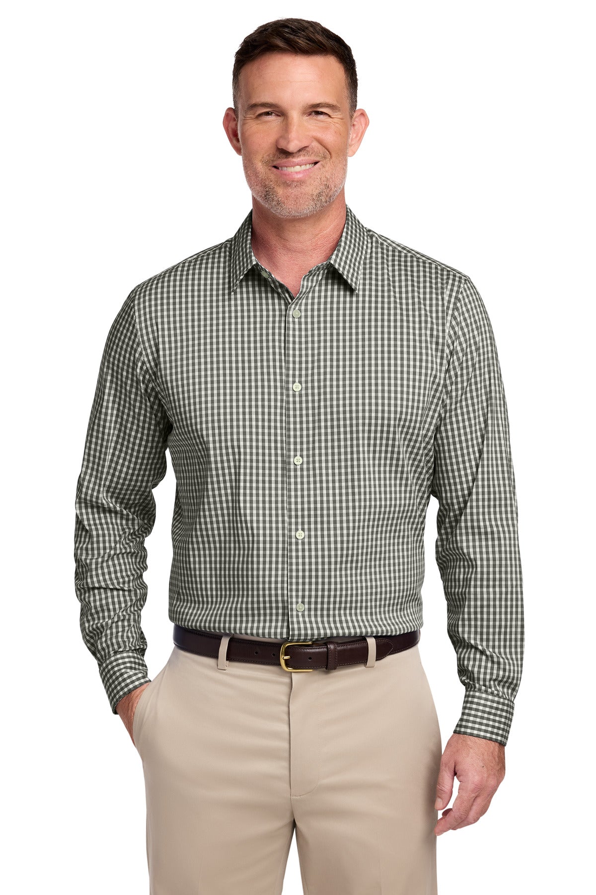 This tech stretch patterned shirt offers a polished look with exceptional all-day comfort. Crafted from a lightweight cotton, nylon, and spandex blend, it features an open collar with removable stays, a sophisticated French placket, and elegant pearlized buttons. Its modern design updates a timeless silhouette, perfect for versatile styling.