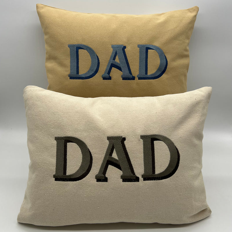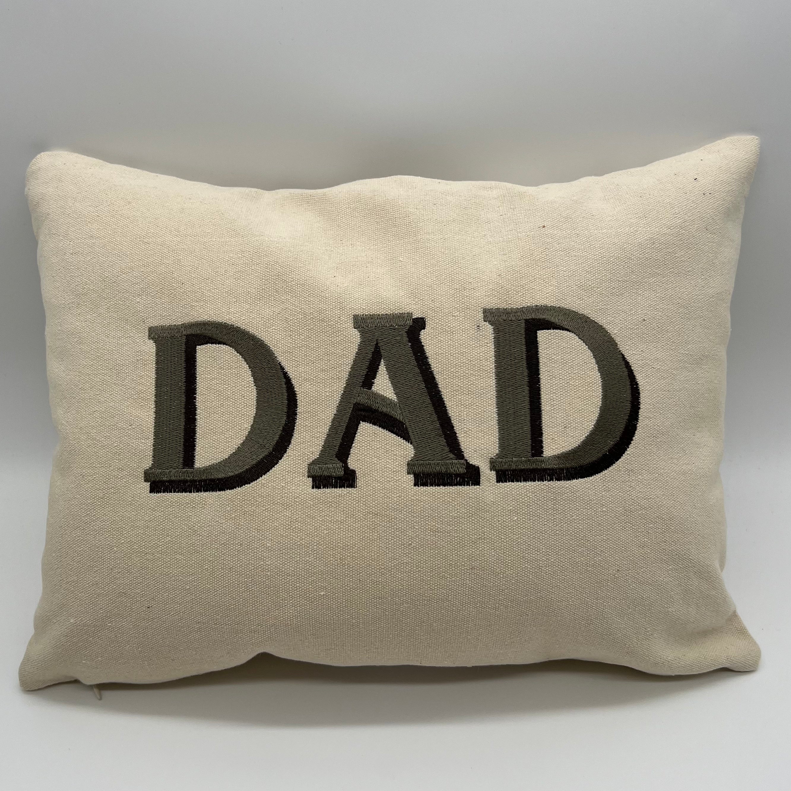 You know that little spot on your back that isn’t quiet straight? Right above your tailbone? This beautifully embroidered “DAD” pillow is perfect for filling that hole and rests perfectly on the back of his favorite desk or at home chair! Made of twill, this 12” x 18” pillow has a synthetic down insert that is just the right squishy!