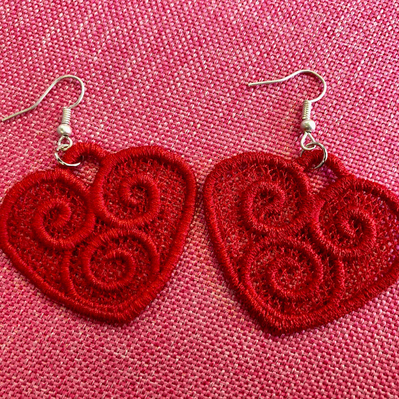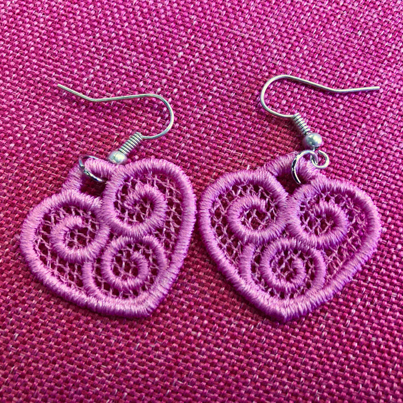 Release your inner romantic with these stylish, embroidered, lace earrings. Perfect for spicing up a date-night outfit or gifting to girlfriends and bridesmaids alike. Embroidered in the Battenburg Lace style and full of spunk for Valentine's Day!