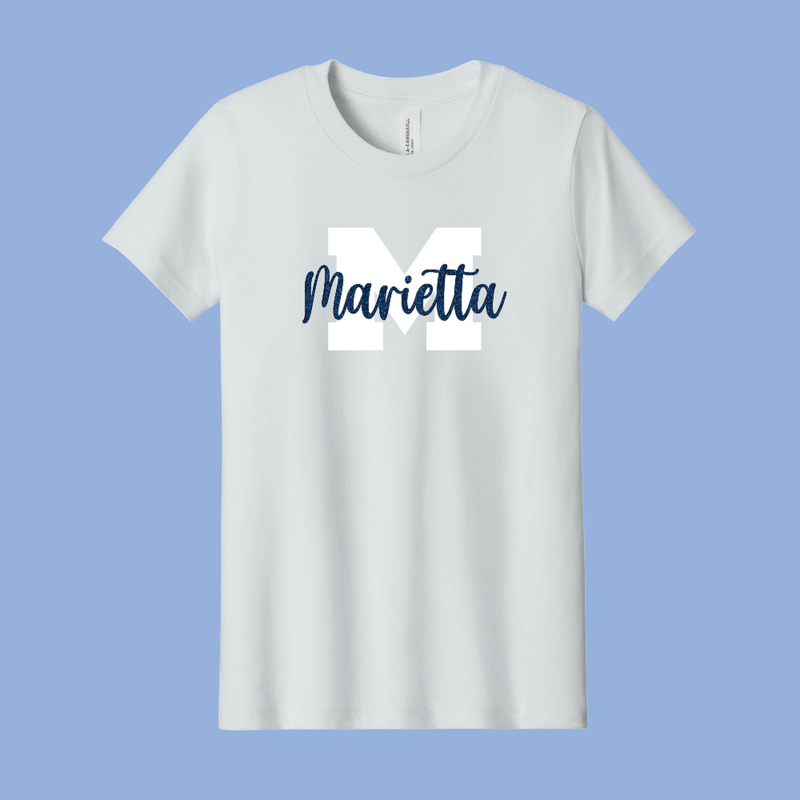 Special for the girls, Marietta in the script font is in glitter colors. On the navy shirt, the font color is silver and on the silver shirt the font color is sapphire!