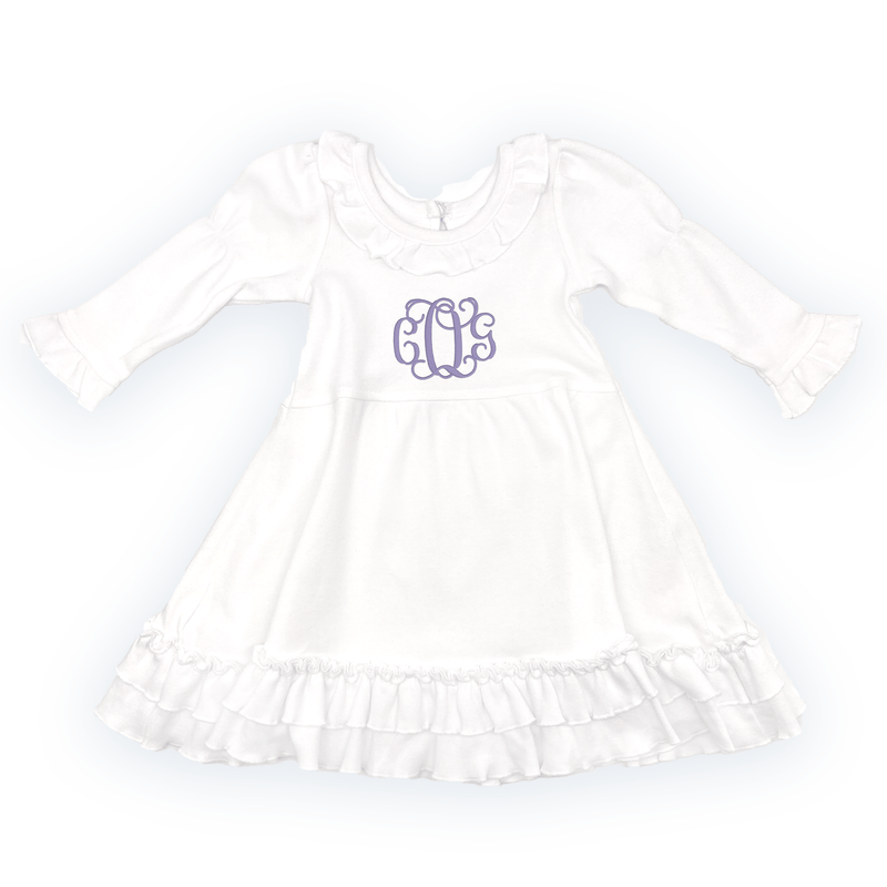Dress your little princess in our adorable girls' dress. Made of 100% interlock cotton, this dress is not only stylish but also comfortable for all-day wear. It features a charming, ruffled collar that adds a sweet touch. With double stitching on all edges, this dress is built to last. Choose from our standard design or opt for the lace-accented version for an extra touch of elegance. Personalize it with embroidery to make it truly unique.