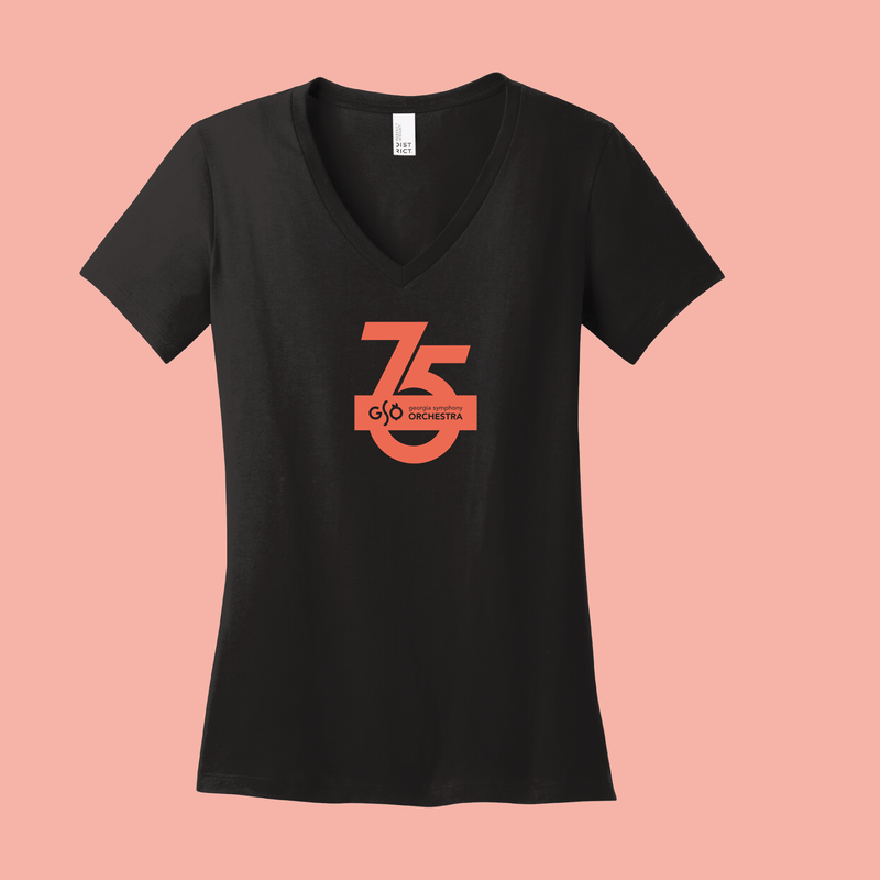 Celebrate the Georgia Symphony's 75th Anniversary in style with a limited edition tee! This ladies v-neck t-shirt features a 4.75" wide profesionally heat-applied vinyl 75th Anniversary Georgia Symphony design, perfect for commemorating your favorite orchestra!