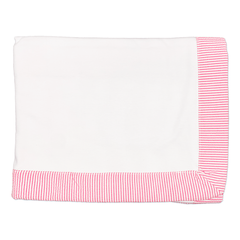 Wrap your little one in comfort and style with our Pink Seersucker Trim Baby Blanket. This blanket features a front of bright white 100% interlock cotton and a soft, 100% cotton backing, ensuring cozy warmth. At 31x27 inches, it's ideal for babies yet large enough for toddlers and beyond.