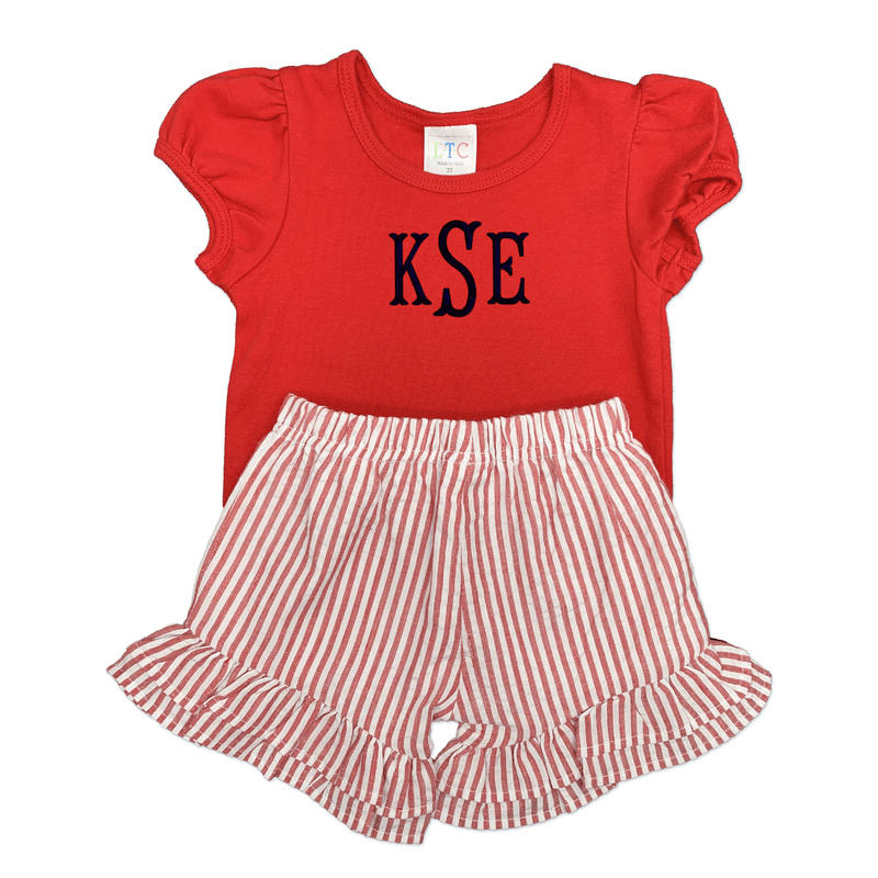 Red Puff Sleeve Tshirt and Stripe Seersucker Short Set